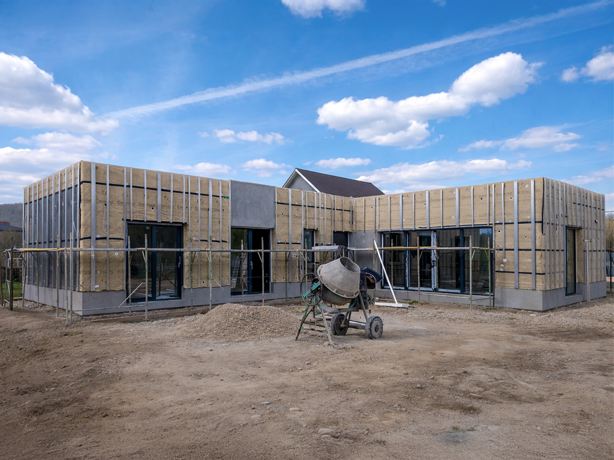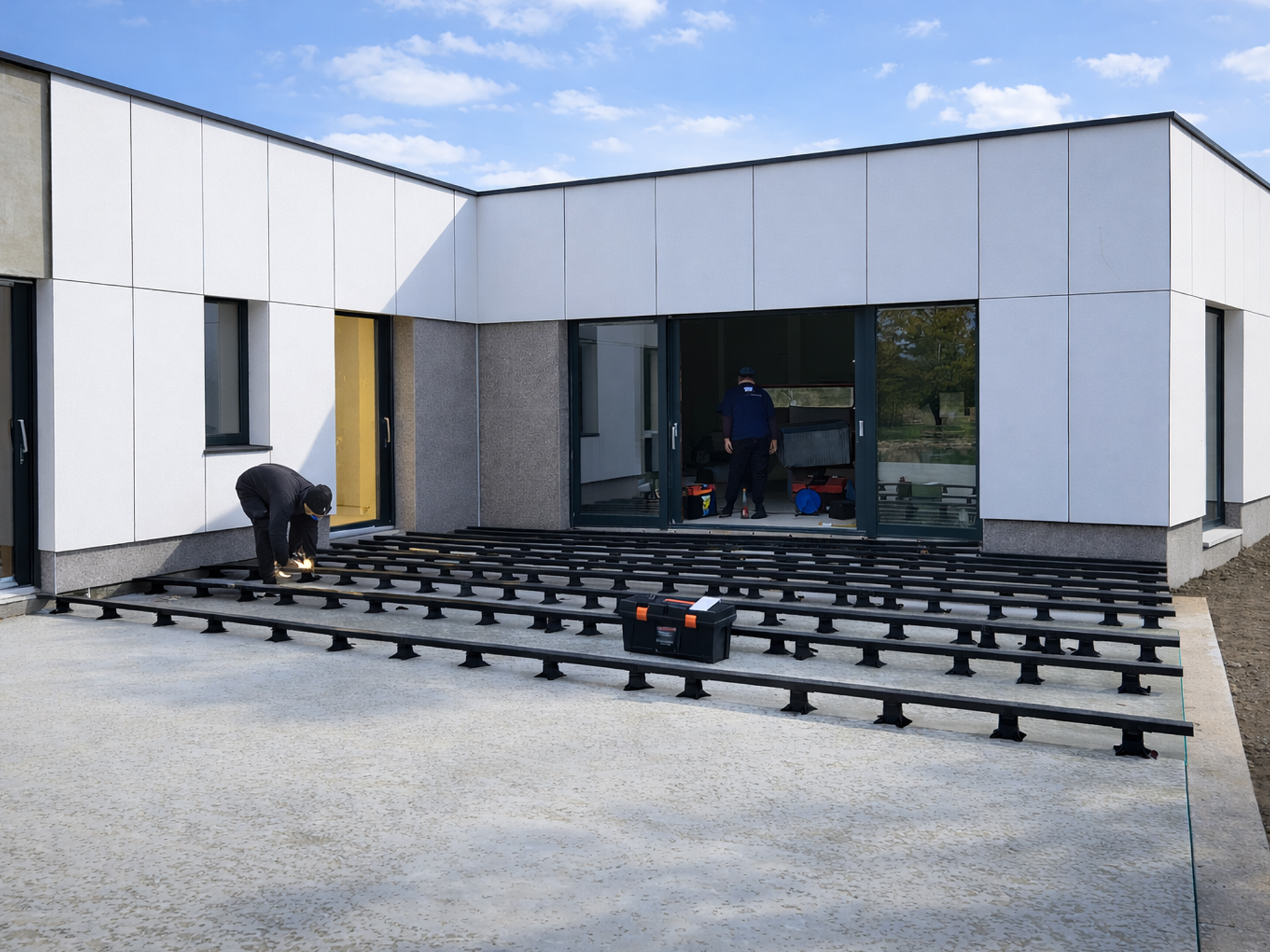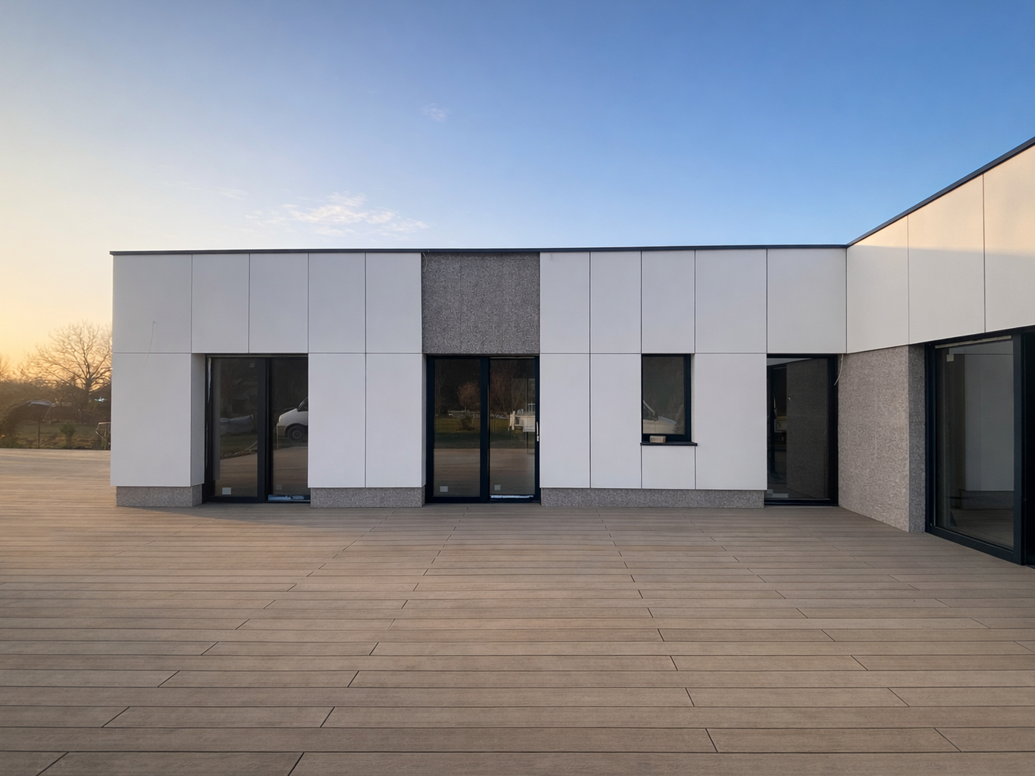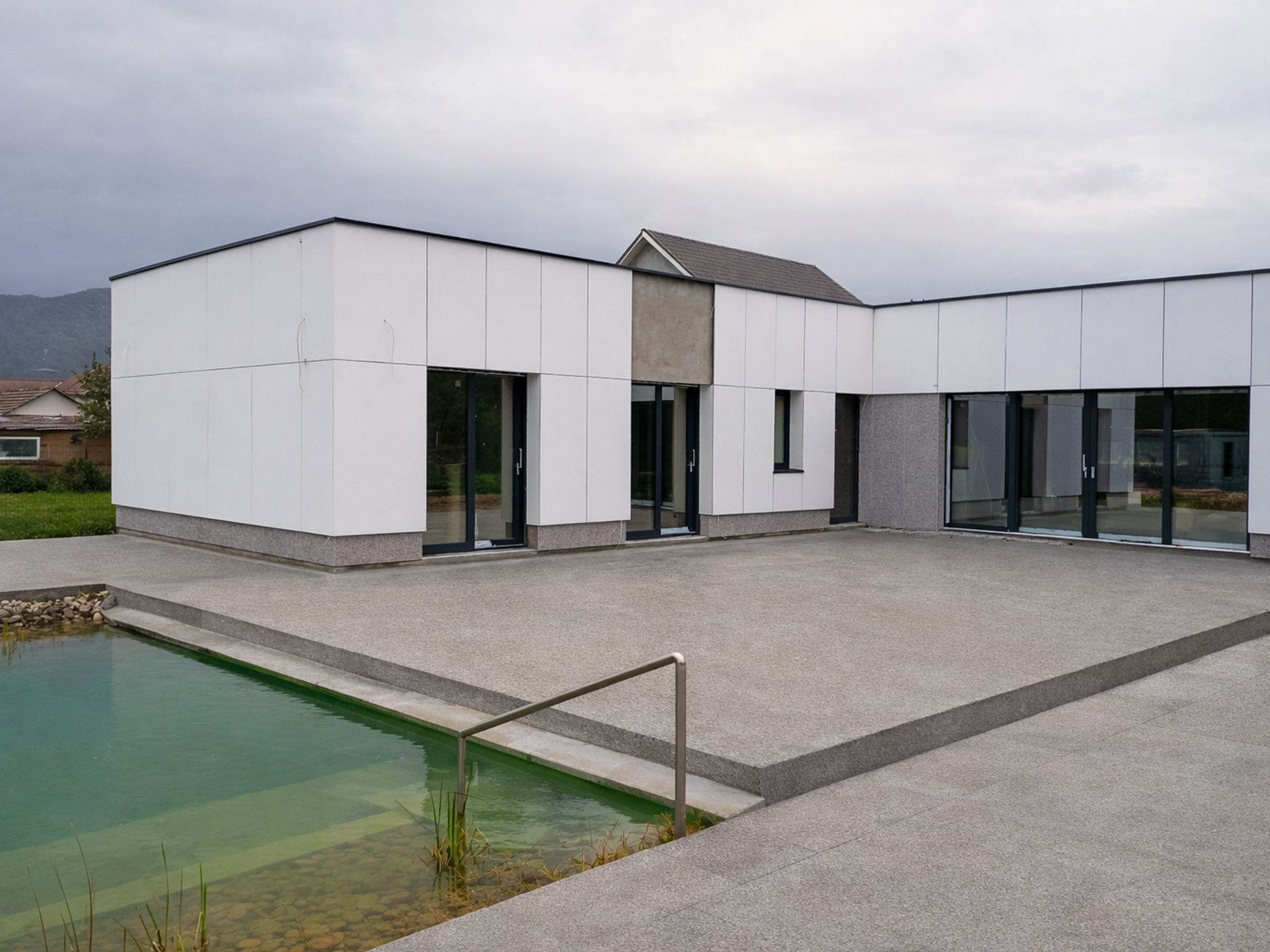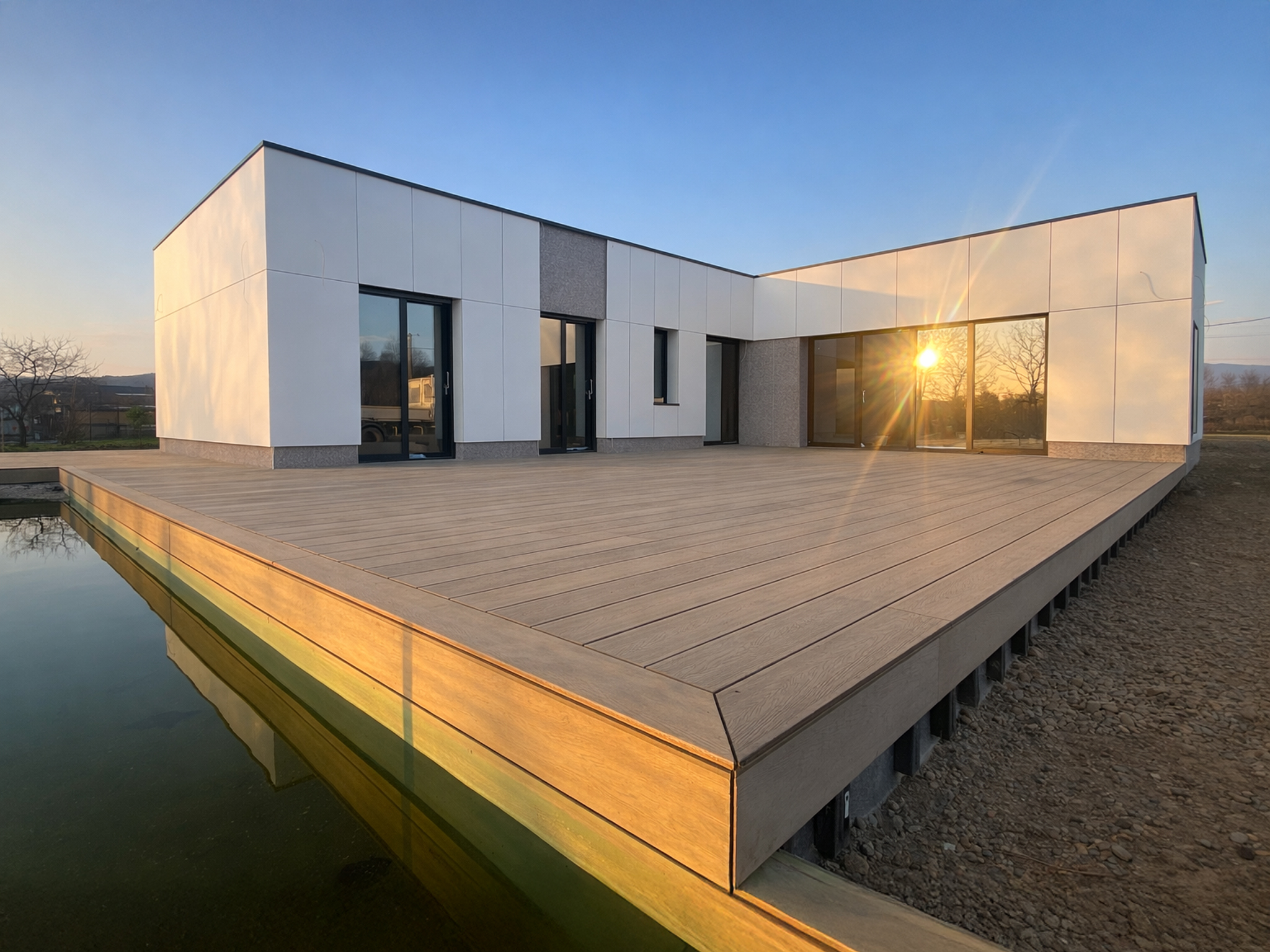 Proiectare, placări, fațadă ventilată, instalații, finisaje interioare la alb, deck exterior.