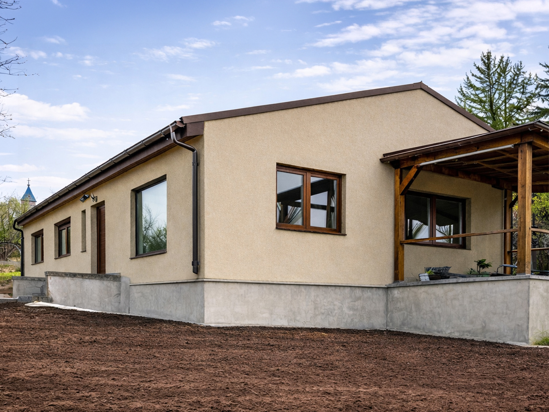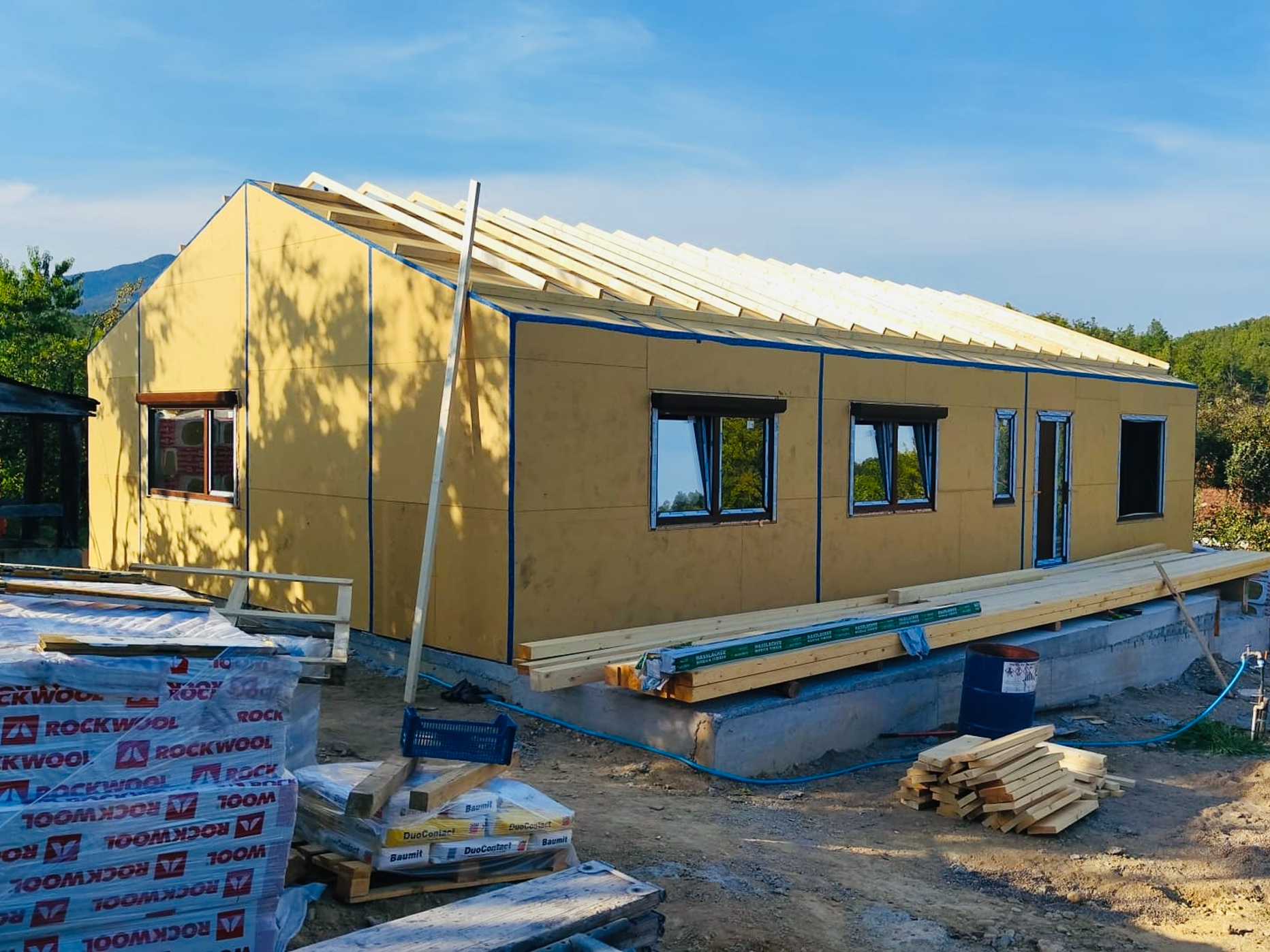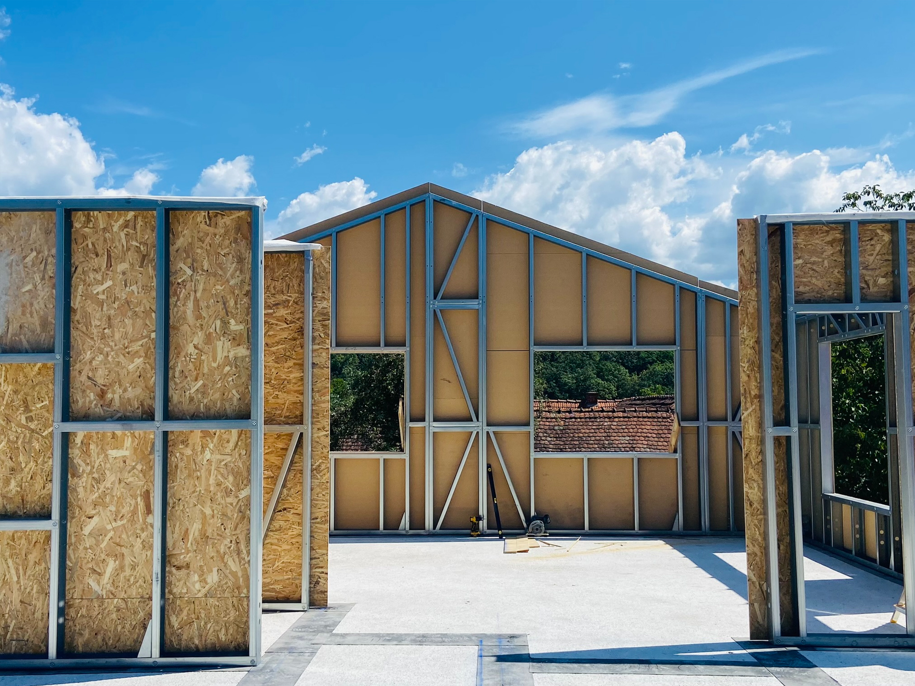 Construcția este realizată pe structură LSF (Light Steel Frame), cu placări exterioare atent alese și acoperiș cu învelitoare din tablă. Implicarea noastră a inclus structura de rezistență, placările exterioare și realizarea acoperișului, asigurând o execuție precisă, durabilă și un aspect coerent pe termen lung.